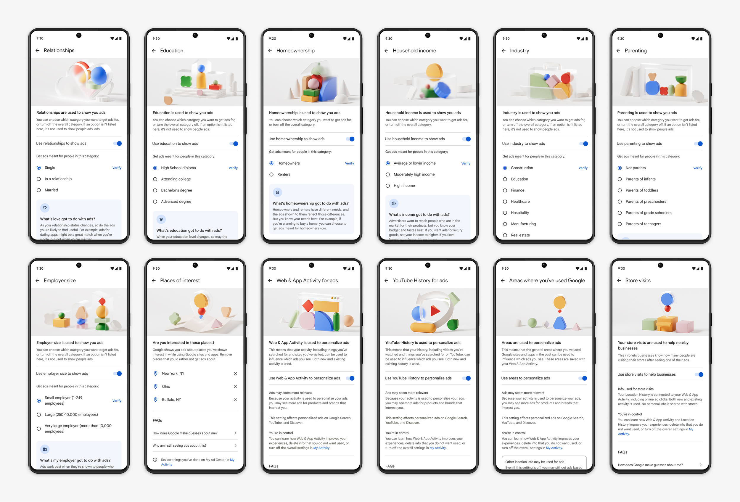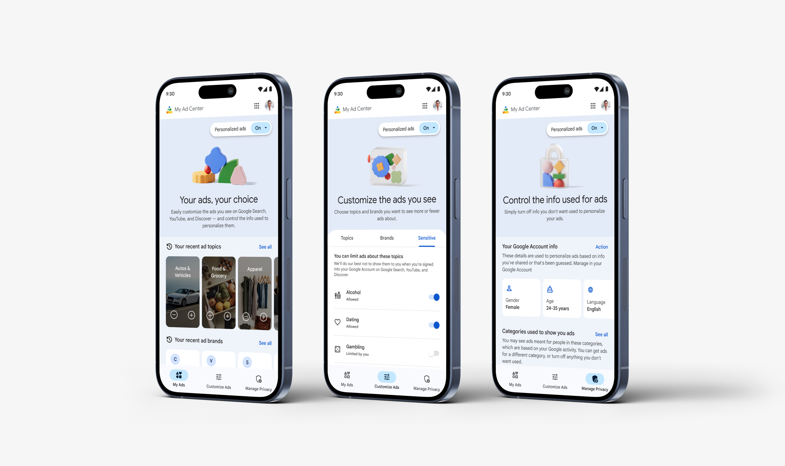 Google My Ad Center empowers users to take control over the ads they see, limit sensitive ads, and gain a clearer understanding of their personalized ad experiences across Google platforms. The project involved defining the visual direction and developing patented interaction design patterns, optimized specifically for the product within the Google design system. The design aimed to simplify ad personalization, providing users with intuitive controls to easily manage their privacy and ad preferences.
